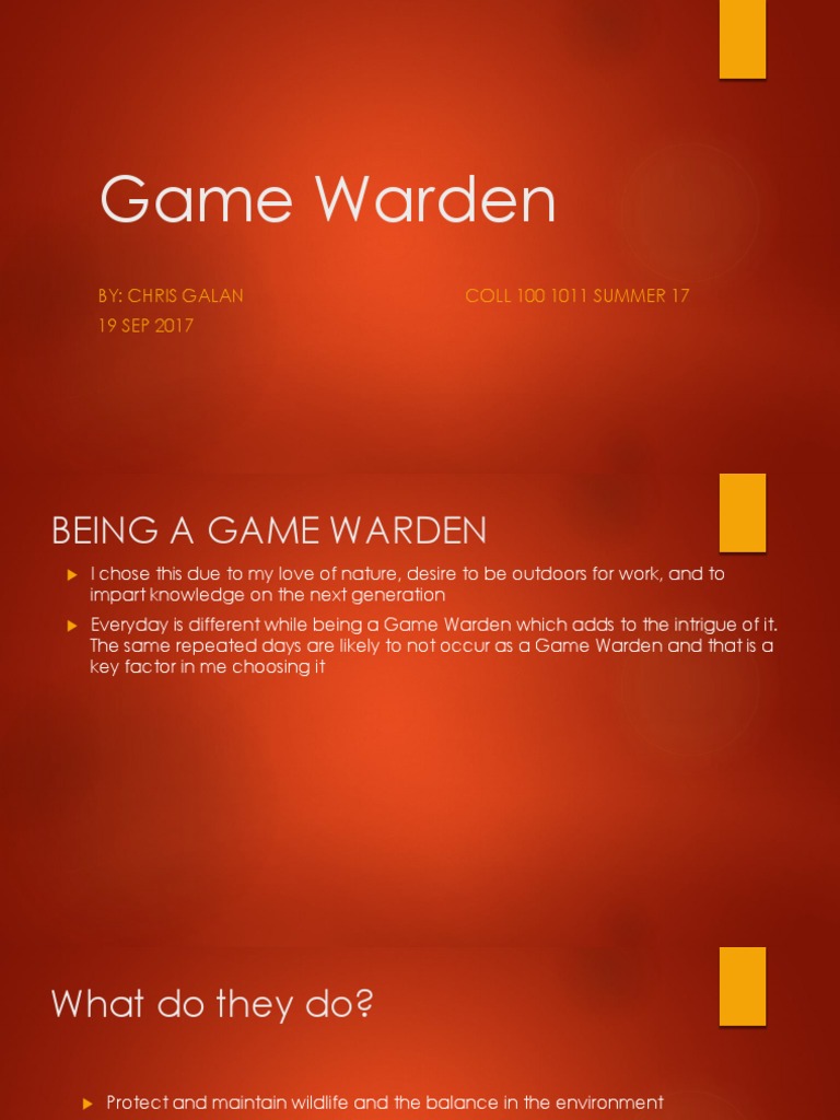 If you believe you have been discriminated against, contact the dnr office of human resources: How to become a wildlife officer. Citizenship or naturalization documents are required; The image, phrase or other expression is found on any clothing item or accessory worn by the member at any time unprofessional or offensive shall include but not limited to: See full list on gadnrle.org Applicants must be in good shape and be able to pass physical tests. 1½ mile track run in less than 16:00 3. Depictions of nudity, violence or criminal activity 2. All medical standards must be met in the areas of vision, hearing, ent, cardiovascular, respiratory, gastrointestinal, rectal, hernia, genital/urinary, back and neck, extremities, nervous system, emotional stability and laboratory analysis. Complete the post physical agility course in less than 2:07 2. Applying for a game warden position can be as simple as filling out a form or as complicated as taking a public service examination depending on the agency. Meet the minimum requirements for employment. Mar 28, 2019 · the requirements for becoming a game warden vary from state to state, but most have similar lists.